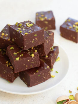 - Transfer the mixture to your prepared baking pan. Garnish with chopped pistachios if desired. Place into the fridge for a few hours until the fudge is set. Let the fudge come to room temperature for about 15-20 minutes and then cut with a large sharp knife.