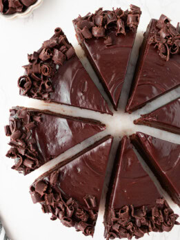 Dark chocolate: I recommend using dark chocolate with around 60% cocoa. If your chocolate contains less cocoa, your cake may not fully set. If you need your cake to be refined sugar free, make sure to use a chocolate sweetened with unrefined sugar.