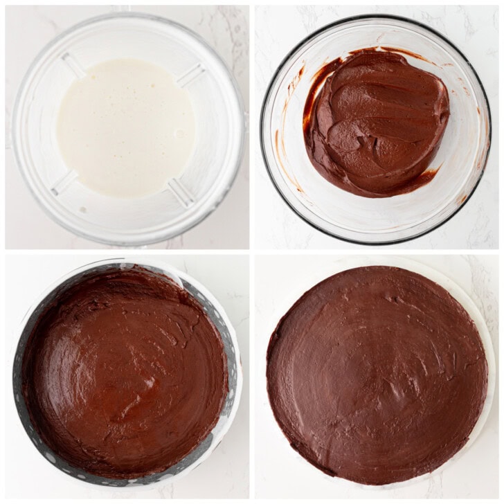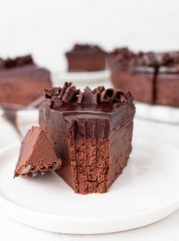 - Put in the fridge to set, around 3-4 hours or overnight. Once cake is set, carefully release it from the cake pan and peel off the parchment paper. If desired, you can frost the cake or decorate it with fresh fruit before serving. I share the ganache frosting I used in the notes section. Use a large sharp knife to cut the cake and wipe the blade after each cut. I recommend cutting thin slices because this cake is very rich. Store any uneaten cake in an airtight container in the fridge or freezer.