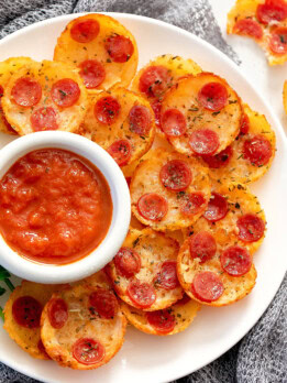 These pizza chips are just 2 ingredients and so easy to make! They taste like pizza in bite-sized form. They work well as an appetizer, side dish or snack. They are also low carb and keto-friendly, but you don’t have to be on a keto diet to enjoy them.