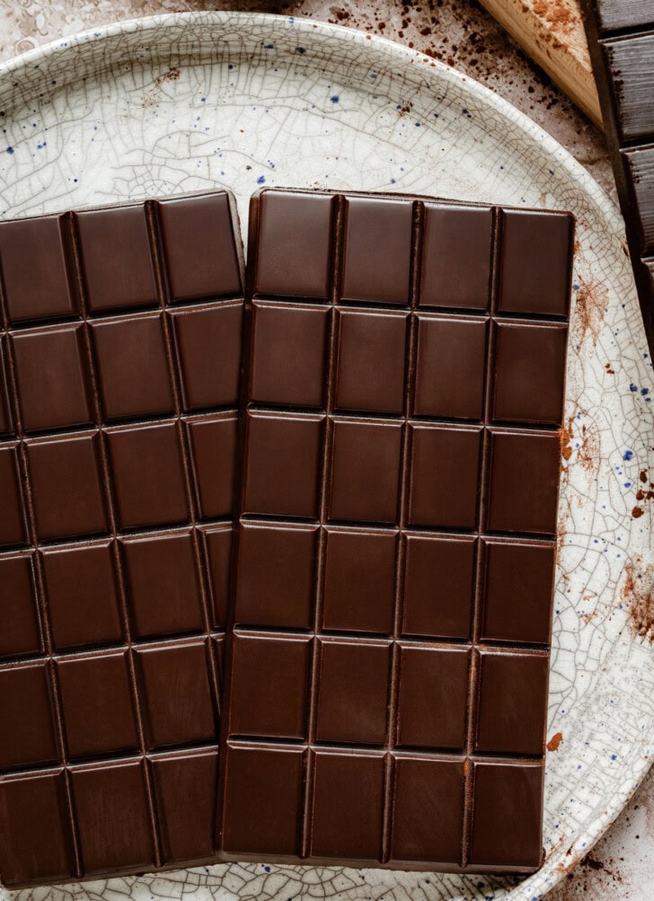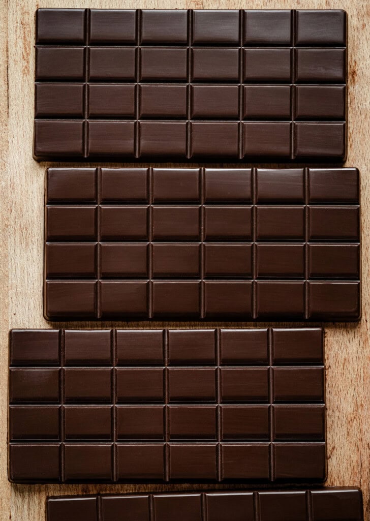 - I used these silicone chocolate molds.* The recipe as written will make 2 large chocolate bars (6.3 x 3.1 x 0.4 inch) using these molds. The set includes 4 molds so you can also double the recipe to make 4 large bars.