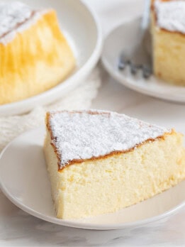 If you’ve ever had Japanese cheesecake, the texture of this cake is very similar to that. It’s a cross between a souffle and a sponge cake. It’s very light, airy, and soft. I actually have a 3 Ingredient Japanese cheesecake recipe as well.