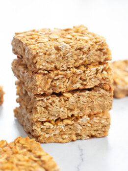 These healthy oatmeal bars are soft and chewy. They are just 3 ingredients and don’t contain any flour, eggs, added sugar, butter or oil. The oatmeal bars are easy to make and store well.