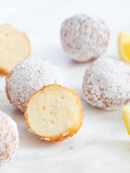 These fluffy lemon flavored donuts are easy to make and only need 3 ingredients. They don’t require any yeast, eggs, or butter. The donut dough takes about five minutes to prepare. These donuts are great for breakfast, brunch or dessert.