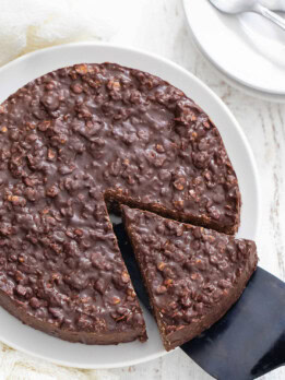 This no bake chocolate oatmeal cake is an easy dessert to make and something a little different from your typical cake. It’s just 3 ingredients and doesn’t require any flour, eggs, or oil. The batter takes only about 5 minutes to prepare. The cake comes out soft and chocolatey with lots of oats mixed in.