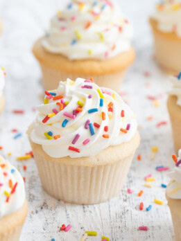 To make funfetti cupcakes, add 1 tsp of vanilla and ¼ cup of sprinkles to the batter. (Stir in the sprinkles at the end, after the batter is fully mixed.)