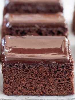 This cake comes out moist and fluffy and tastes very much like a traditional sheet cake. Because there is no oil or butter, the crumb is a little firmer, something you will often find with cakes made without butter or oil. If you want a more tender cake and don’t mind using oil, you can replace 1/3 cup of the milk with vegetable or canola oil.