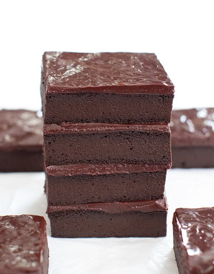 The brownies have a soft, velvety texture and a rich cocoa flavor. They remind me a little of the center of a truffle if it were turned into a brownie. The brownies are not super sweet. If you prefer sweeter brownies, you can a sweet frosting on top.