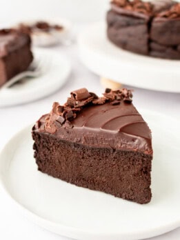 This cake is very moist, fudgy and soft. Since it is not made with flour, it will not have the traditional cake crumb. The cake has a strong cocoa flavor and is lightly sweetened. Because this cake is meant to be a healthier cake, it is only lightly sweet and has a bittersweet level of sweetness. If you prefer sweeter, you can add more maple syrup to the cake or serve it with a sweet chocolate frosting.