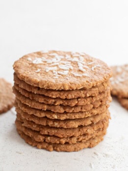 Maple syrup: The cookies are lightly sweetened with maple syrup. Maple syrup also helps the cookies crisp up. I don’t recommend using honey. The cookies don’t crisp up as much using honey.