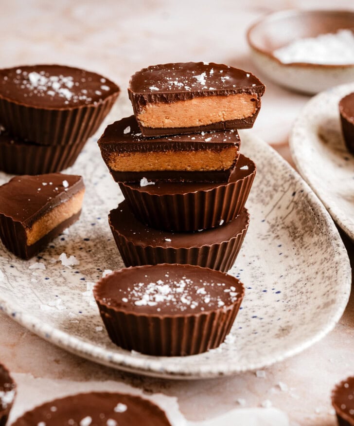 These peanut butter cups really taste like the classic candy. The filling is creamy but has some texture to it and the peanut butter cups are covered in a chocolate shell. You can customize these with a milk or white chocolate shell as well. I especially love that you don’t need candy molds or any special tools to make these.