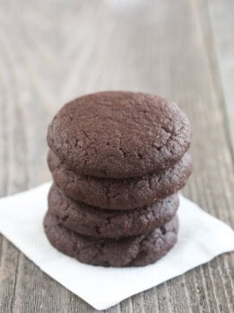 These dark chocolate cookies have an intense bittersweet chocolate flavor. Plus, they are easy to make because you don’t need a mixer. Just mix up the dough with a bowl and spoon and the cookies are ready to bake.