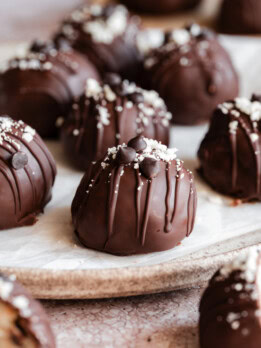 - Estimated nutrition does not include optional mini chocolate chips and assumes 1 cup of dark chocolate for the coating because not all of the chocolate ends up on the coated balls.