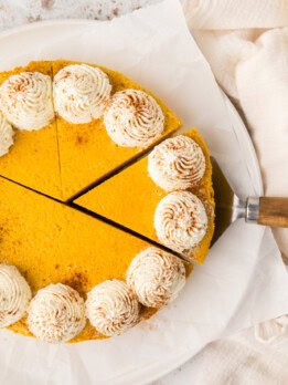 This cheesecake is very creamy and has a strong pumpkin flavor. Unlike traditional cheesecake, it is not made with cream cheese. Instead it is made with cottage cheese but you won’t be able to taste the cottage cheese at all.