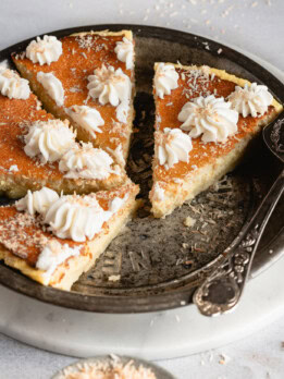 This old-fashioned pie recipe is one of my favorite recipes to make in the summer. It is a version of impossible pie but also includes coconut. The batter takes less than five minutes to prepare and then it’s ready to go in the oven to bake. Unlike most pies, you don’t need to make a separate pie crust or even use store-bought pie crust. Instead, when the batter is done baking, you will have a pie that already has a crust.