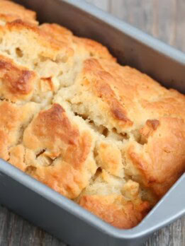 This apple cider bread is easy to make and tastes delicious. It’s made with hard apple cider, fresh apples, and apple butter so it’s loaded with flavor. The texture is similar to yeast bread without having to use yeast and it smells amazing while it bakes.