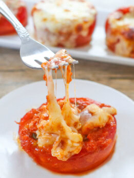 These easy stuffed tomatoes are filled with marinara sauce and topped with melted cheese. They are so simple to make and are great as a side dish or light dinner.