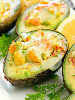 Avocados are stuffed with a creamy shrimp filling and sprinkled with cheese before being baked for a warm, melted cheese finish. These baked shrimp stuffed avocados are ready in less than 30 minutes.