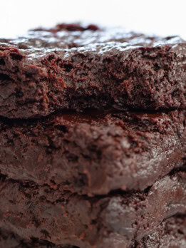 Even though these brownies don’t contain any flour, they look and taste like traditional brownies made with flour. These brownies have a chewy crumb and a not-quite-set fudgy and gooey center. If you like brownies that are cakey and fully set, these brownies may not be for you.