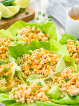 - Add a few spoonfuls of ground chicken to the center of each lettuce leaf. Garnish with scallions. Drizzle chicken with more bang bang sauce. Serve immediately.