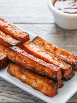 Brush them with more BBQ sauce before serving. I like to serve the tofu fries with BBQ sauce on the side for dipping.