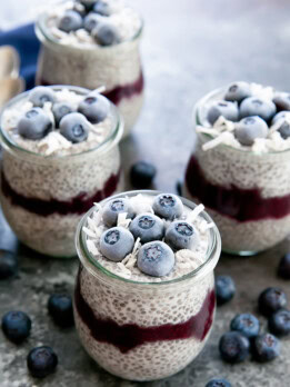 To make this blueberry coconut chia pudding, all you need are blueberries, coconut milk and chia seeds.