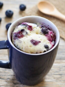 - Combine all ingredients except blueberries in an oversized microwave-safe mug. Mix with a small whisk until batter is smooth. Stir in blueberries (Make sure you stir these into the batter. If you leave them on top they might burst open onto your microwave).