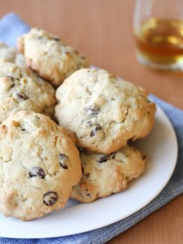 These bourbon cookies are chocolate chip cookies with a whiskey twist! They are inspired by a classic bourbon breakfast cocktail and but baked up in cookie form. They are thick and cakey and perfect for dunking in a glass of milk.