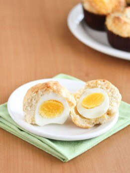 - These breakfast muffins start with a simple muffin batter that reminds me a lot of cheese biscuits. The egg is wrapped in the batter and when baked, the muffins puff up and look like plain cheese muffins, but when you slice the muffin in half you see the cooked whole egg inside.