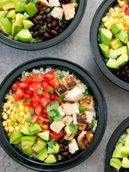 The burrito bowl contains healthy versions of many ingredients you’d find in a typical burrito, including corn, black beans, salsa and avocado. The star of the filling ingredients is the chicken. The juicy pieces of chicken are first marinated in fajita seasoning, which adds so much flavor to the chicken and the bowl.