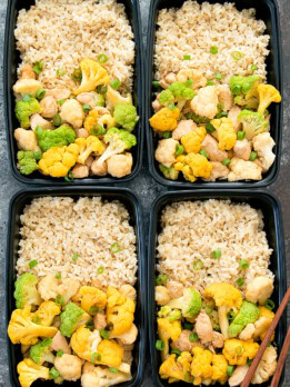 - Add 1/2 cup of brown rice to each of your meal prep containers. Divide your stir fry into 6 equal portions and add to the containers. Garnish with scallions. Store in fridge or freezer.
