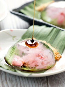 Japanese raindrop cake filled with cherry blossoms. This unique low-calorie dessert, known as mizu shingen mochi, is made of just agar powder and water.