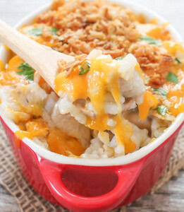 - Preheat oven to 375°F. Add rice mixture into a large casserole dish, spreading evenly across. Sprinkle surface with cheddar cheese. Cook for 15-20 minutes until everything is heated and bubbling. Top with fried onions and parsley (if using) before serving.