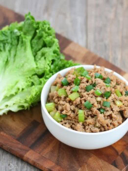 This dish has a quick prep time and the cook time for the filling is fast, too. Once you make it, you serve it with some large lettuce to wrap the filling up to enjoy. I like the contrast of the cold lettuce leaves with the warm filling. They’re really delicious.