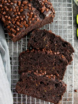 This easy quick bread requires no mixer. It is super chocolatey and moist and you can’t taste the zucchini at all.