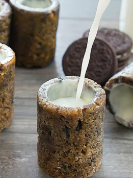 These cookies and cream flavored cookies are baked in shot glass molds and filled with milk for the ultimate milk and cookies experience.