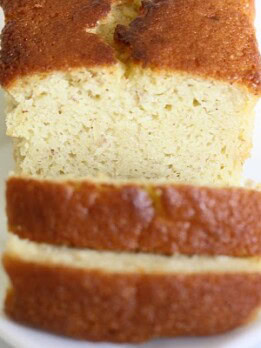 I used my 7×3” loaf pan for this recipe, but you can use an 8×4″ loaf pan. You will need to generously grease the pan with butter. This will ensure the cake releases when you turn it out to cool.