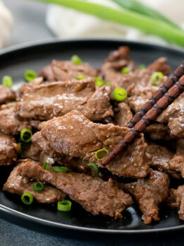 On weeknights, I tend to do a lot of quick and easy stir fry dishes and this garlic beef is one of my go-to dishes. The beef is tender and flavored with garlic and soy sauce. It’s such a simple dish, yet super flavorful and versatile. You can serve the beef by itself, toss in some vegetables, or add some garlic noodles on the side.