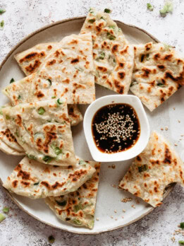 Learn how to make Chinese scallion pancakes which are lightly fried dough flavored with scallions. They’re are lightly crispy with a chewy texture and a fun kitchen cooking project.