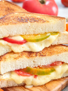 Sometimes the best things are the simple things. I’ve made so many grilled cheese sandwiches this year, but this one is one of my favorites. The idea actually came about because one day we came home after a weekend away with no groceries in the fridge. Mr. K was hungry and so I surveyed the contents of our kitchen and realized we had enough to make grilled cheese and tomato sandwiches, using the cheese from my cheese stash, tomatoes from the garden, and leftover bread on the counter that was starting to get stale.
