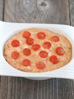 - Place in an oven-safe glass bowl. Add in half the pepperoni and mix, keeping the pepperoni in the middle of the dip rather than on top. Heat for about 15 minutes until dip is hot. Remove from oven and top with remaining pepperoni. Serve immediately.