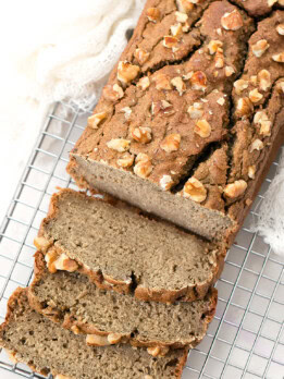 Banana bread is usually very sweet but I wanted to create one that wasn’t because I’ve had so many requests recently for low sugar recipes. This banana flavored bread is not very sweet on its own. If you prefer a sweet banana bread you can easily do that by adding some maple syrup to the batter (about 3 tbsp) or adding chocolate chips to the batter.