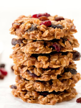 The nut butter-free version is mainly oats and raisins. The cookies don’t brown, and the oats are finely chopped, so they don’t look as much like oatmeal cookies. If you’re trying to save some calories or are avoiding nut butter, I recommend trying this one.