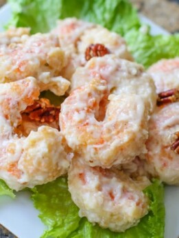 Honey walnut shrimp just like you get at Chinese restaurants. Lightly breaded shrimp coated in a creamy sweet sauce and served with candied walnuts. This Honey Walnut Shrimp is easy to make and only takes about 30 minutes!