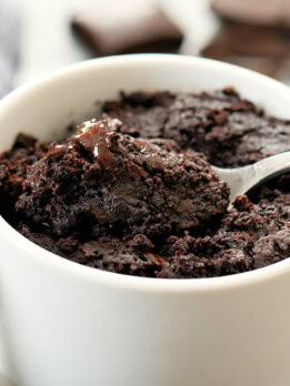 The brownie has a very fudgy texture. However because there is no egg acting as a binding agent, the crumb is a little loose. You will not be able to remove this brownie in one piece from the mug, so it is best eaten in the mug. I also don’t recommend adding an egg to the recipe as it will change the texture of the brownie and make it less fudgy and more like a cake.