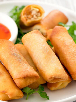 - Add a few eggrolls at a time, cooking until golden brown on all sides. Serve eggrolls while hot with your favorite dipping sauce. I served mine with sweet chili sauce.