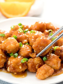 This keto orange chicken is a low-carb version of classic Chinese orange chicken. Chicken is lightly battered, fried, and then coated in a sweet and savory orange sauce.
