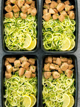 - Drain water from zucchini noodles and then add to meal prep containers. If desired, squeeze fresh lemon juice over food before eating.