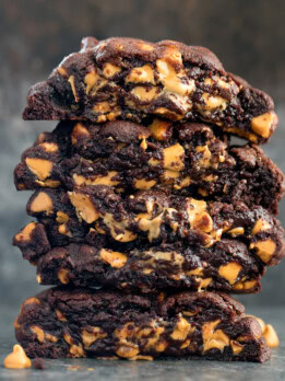 This is a copycat version of Levain Bakery’s Dark Chocolate Peanut Butter Chip Cookie. I think these taste almost exactly like the original ones. The cookies are thick and have a very rich chocolate flavor. They have a gooey melted center and are also packed with peanut butter chips.