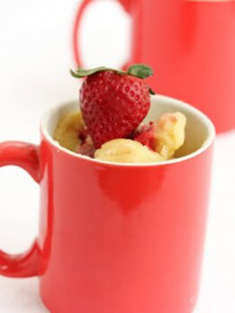 - Combine all ingredients except strawberries into a microwave-safe mug. Stir with a small whisk or fork until batter is smooth. Pour half of the batter into another mug. Carefully drop strawberry pieces on top.